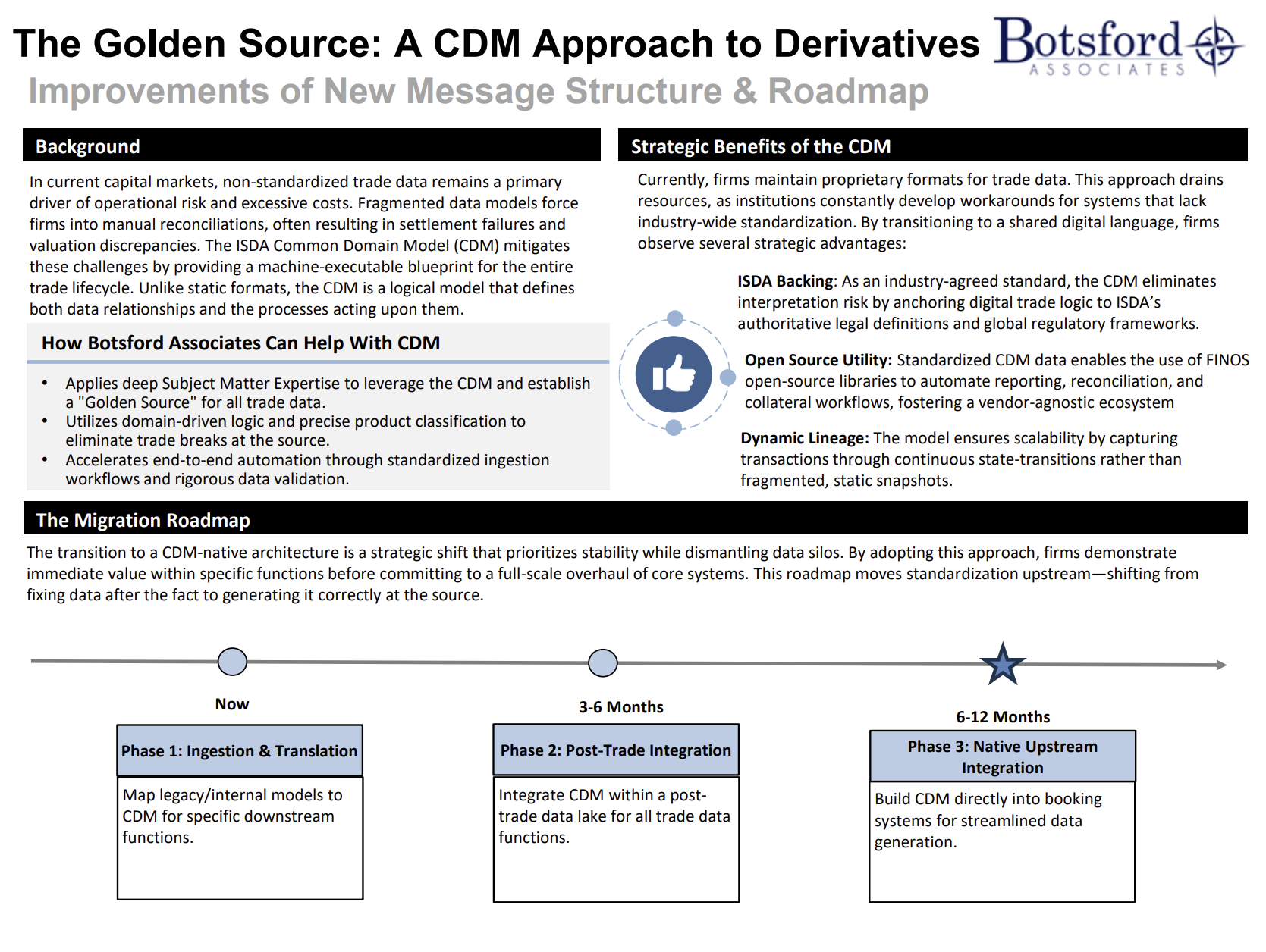 We explore how firms can move from fragmented, proprietary data models to a machine-executable, industry-aligned “golden source” using the ISDA Common Domain Model (CDM), through a practical migration roadmap—from mapping legacy models to CDM, to embedding CDM directly into post-trade and upstream booking systems—showing how standardization reduces downstream fixes, improves auditability, and unlocks automation across reporting, risk, and collateral.